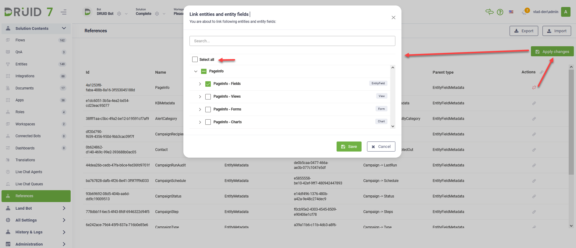 • Enhanced Solution References. In our latest update, we've refined the process of linking entities from Solution References and applying changes. Now, within the "Link Entities and Entity Fields" pop-up, users have the flexibility to select not only the entity fields but also its associated web views, forms, and charts. This enhancement streamlines the workflow, providing users with comprehensive control over entity elements selection for seamless integration into their solutions.