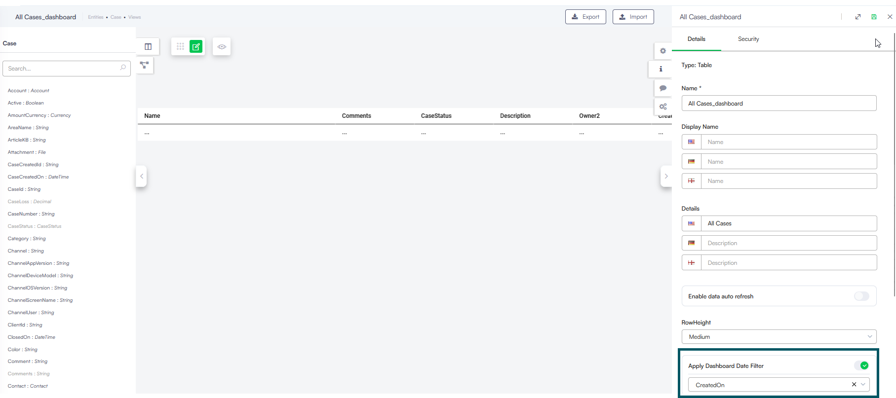 • By enabling the Apply Dashboard Date Filter toggle and selecting a date-type field from the dropdown directly within any classic view configuration, you can instantly synchronize a table with the dashboard time range. This update removes the tedious setup of building custom filtering integrations, allowing you to reuse existing views while maintaining full filtering functionality. For more information, see Filtering table records on the dashboard.