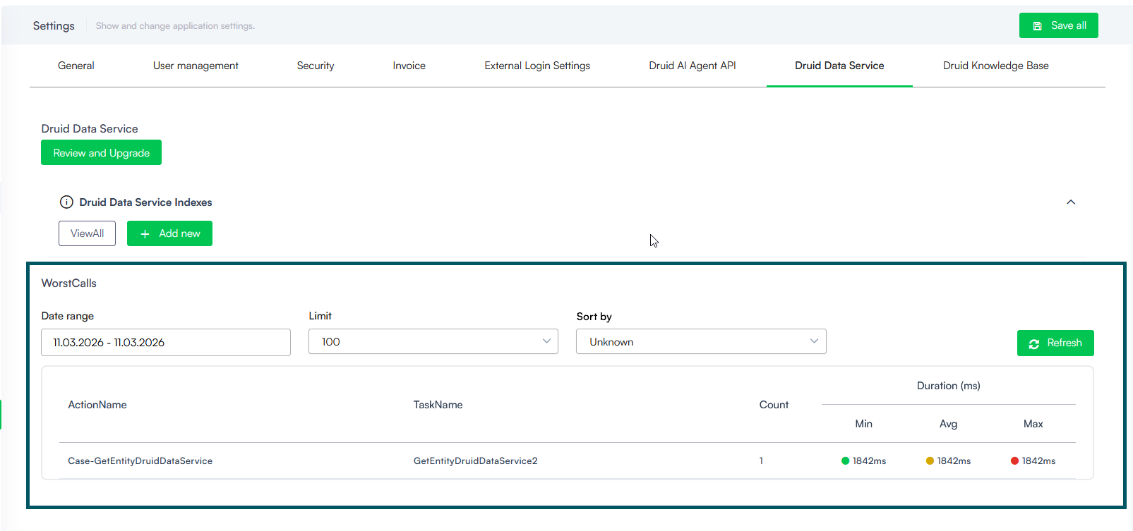 • Data Service Performance Monitoring (Worst Calls). We have introduced a new WorstCalls section within the Druid Data Service settings to help you identify and optimize slow-running integrations. This monitoring tool is designed to give you immediate visibility into any Data Service integration that takes longer than 1 second to execute.