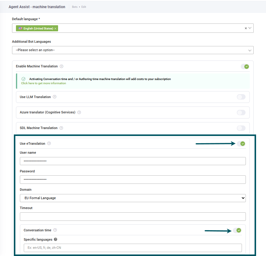To use eTranslation machine translation, select Use eTranslation and enter the following details: