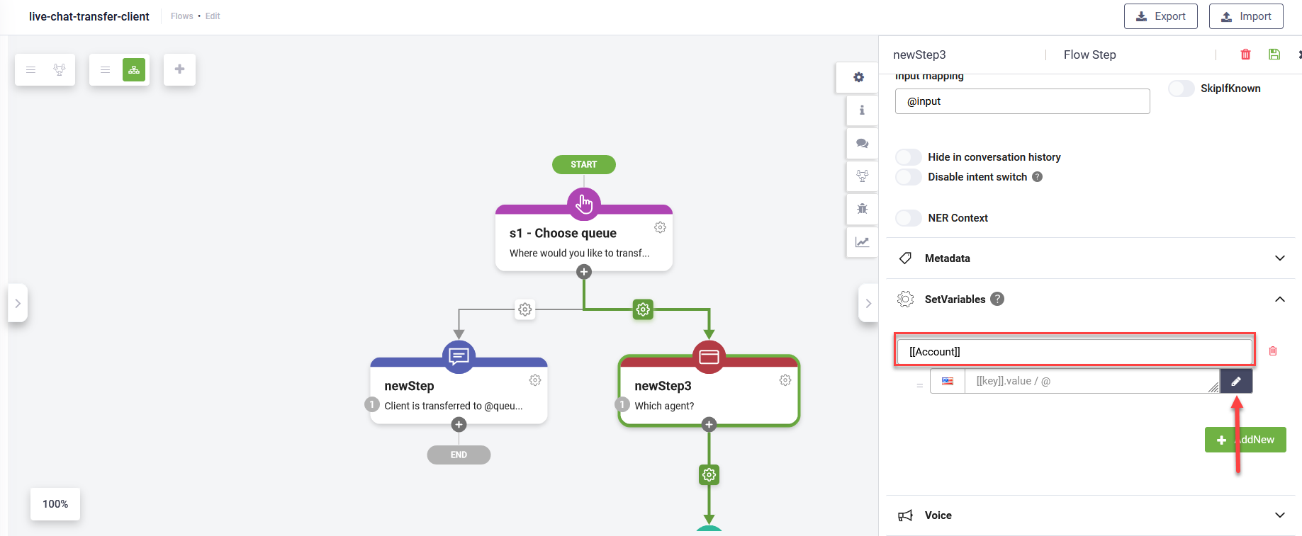 In the Code Editor, entities from the conversation context are referenced with the same syntax you are already familiar, using brackets. Example: [[ChatUser]], [[Account], etc.