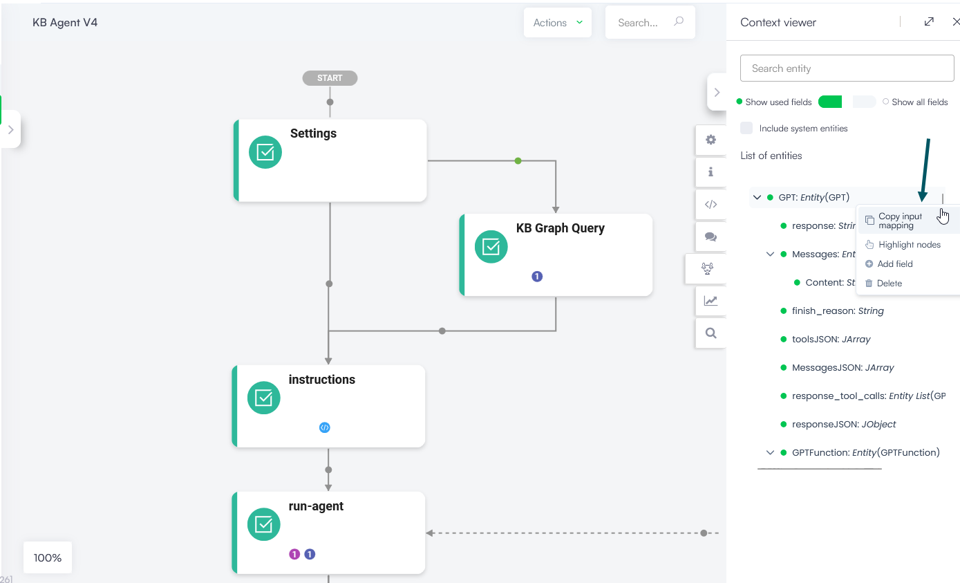 When building a conversational flow, keeping track of which entities and fields are used across steps can quickly become complex. The Entity Context Viewer gives you a centralized view of all entities used throughout the current flow, helping you author more accurately and efficiently.