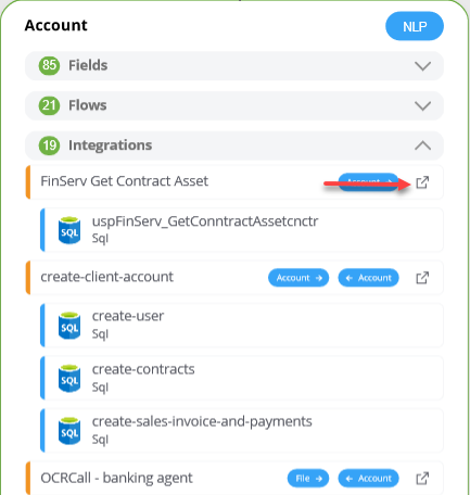The Entity Designer enables you to easily navigate to a specific flow or integration where the selected entity is utilized. Simply click on either the Flows or Integrations section, and then click on the "go to" link icon (