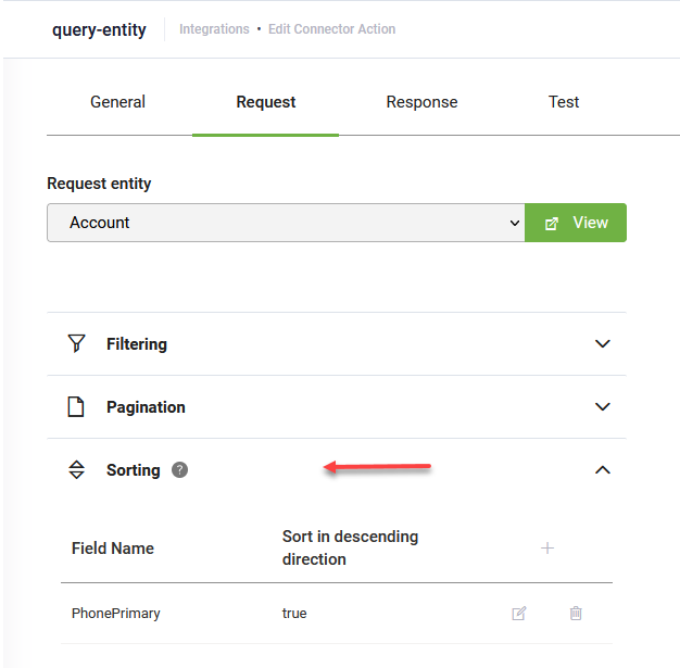 By default, all records are ordered ascending by the Id field. You can sort the returned records by one or multiple fields. To change the records sorting order, in the Sorting section, set the following properties: