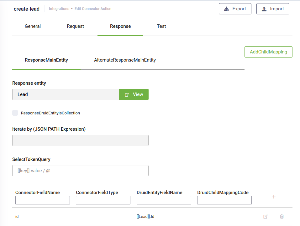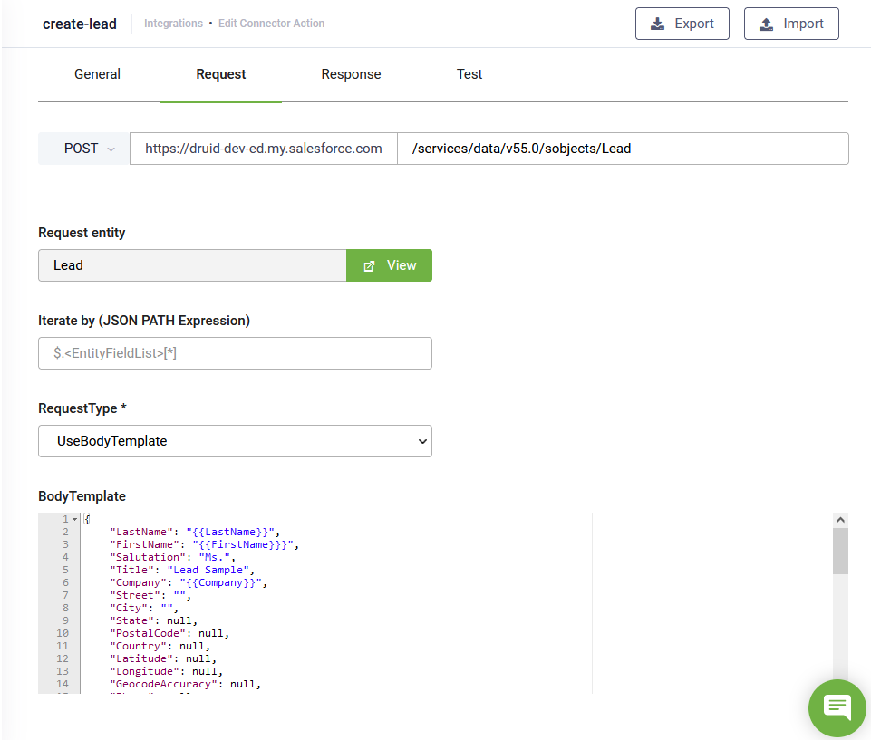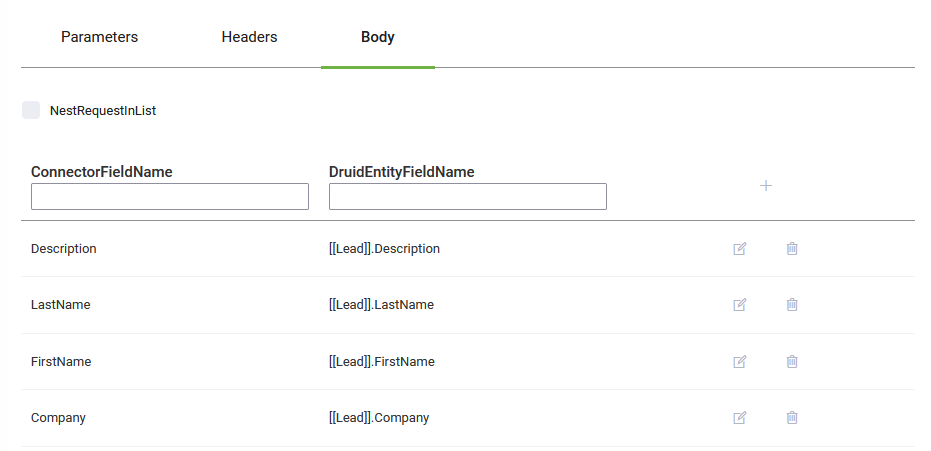 Clicking the Body tab and you will see the mapping of the fields provided in the request (BodyTemplate field) to the DRUID fields, which will store the values returned by the API.
