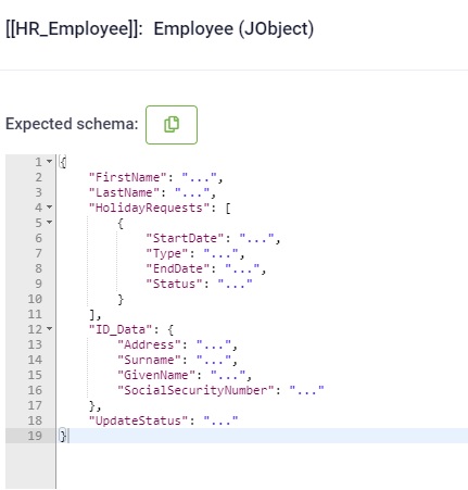 Following the mapping reference table, this section provides mapping examples for sending the list of holiday requests and the Identity Card information for a specific employee, to a UiPath process.