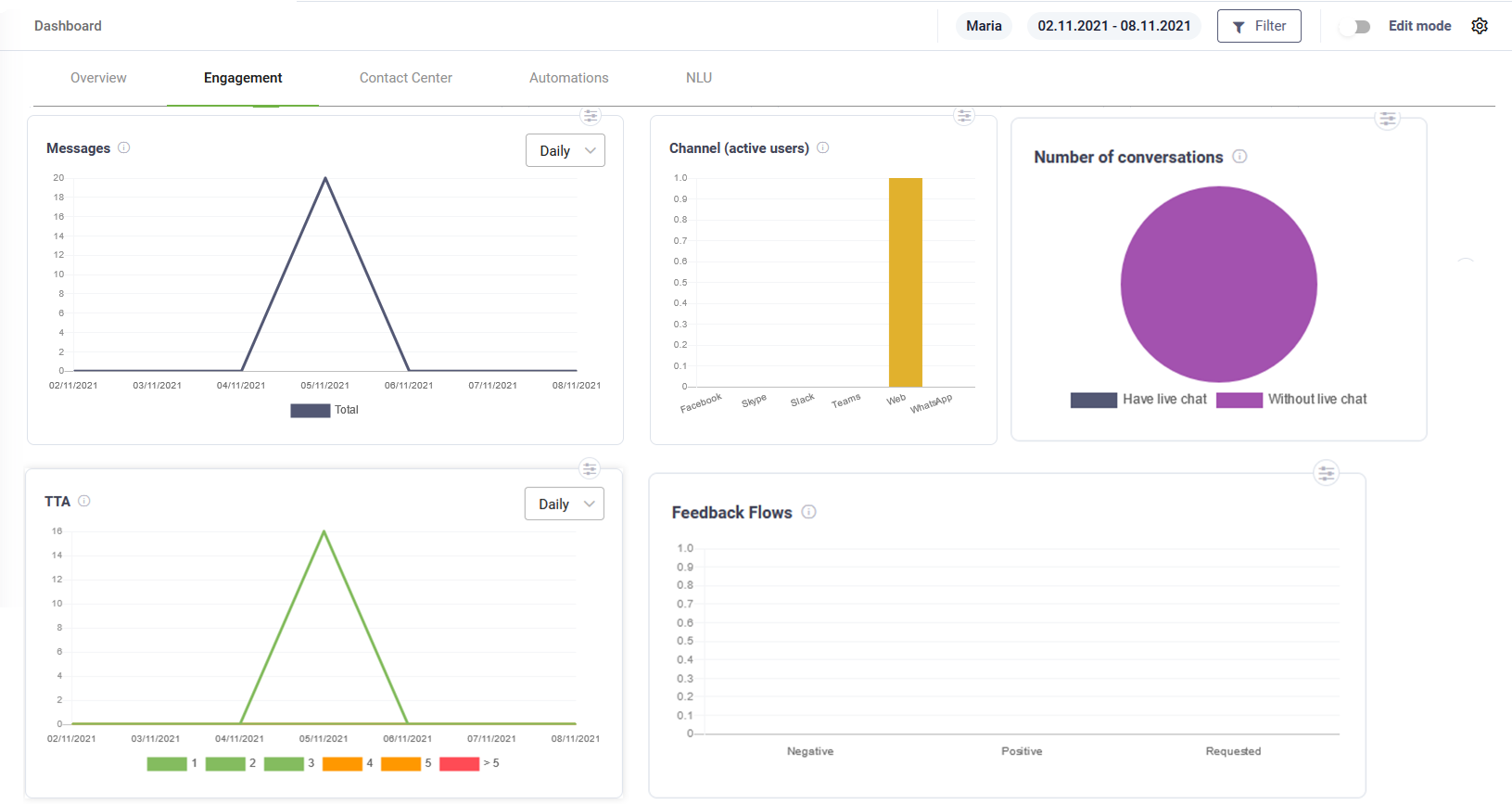 To create a dashboard, select the bot and solution and from the Solution Contents menu, click Dashboards. At the top-right corner of the Dashboards page, click the Create new dashboard button. The Create new dashboard page appears.