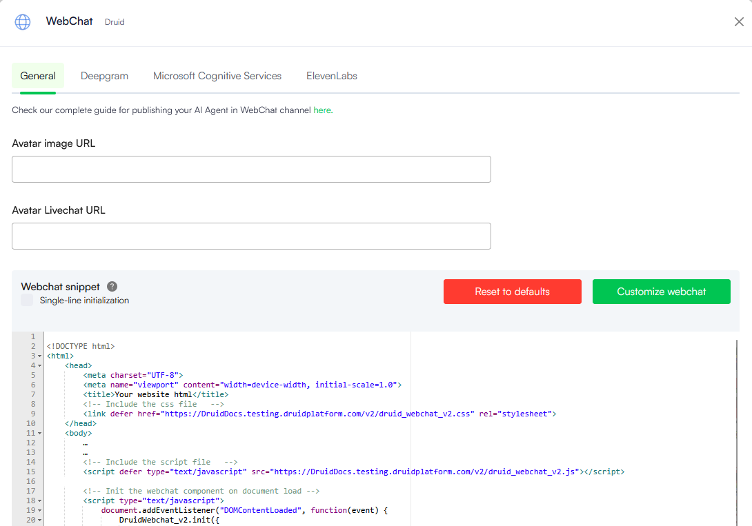 Druid enables seamless voice interactions within the WebChat channel, allowing users to switch from text to voice conversations using a microphone icon in the chat snippet.