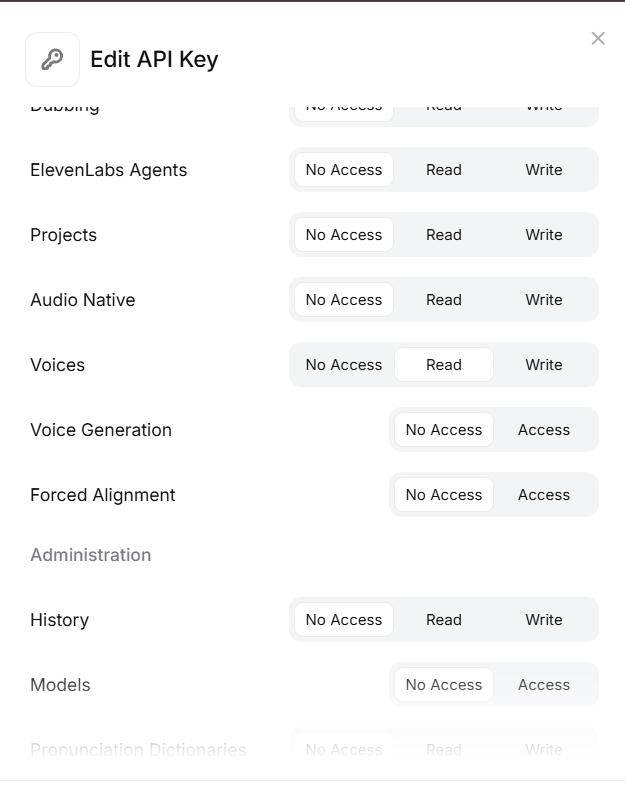 - You need an ElevenLabs API Key. To get API key, go to https://elevenlabs.io/app/developers/api-keys and copy the key ID.