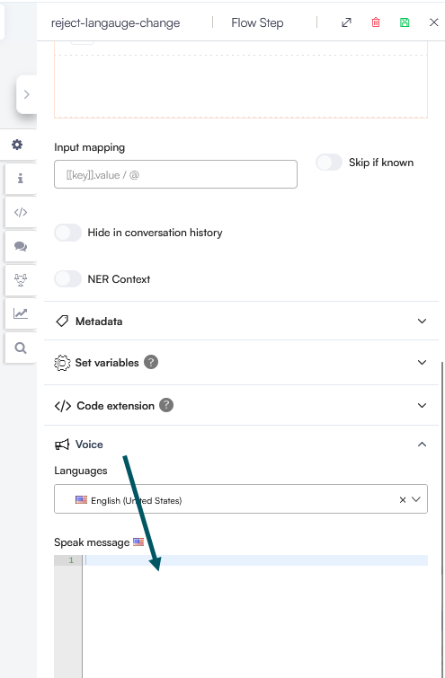 To ensure a high-quality voice experience, use the Voice section in your flow steps and enter the message for voice in the Speak message field