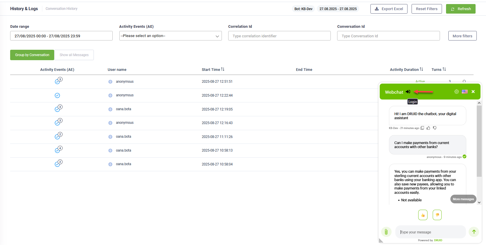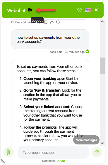 For users accessing the web chat from inside the DRUID Portal, the conversation can be authenticated automatically. The Login and Logout icons are always present in the chat header, ensuring seamless Portal user authentication.