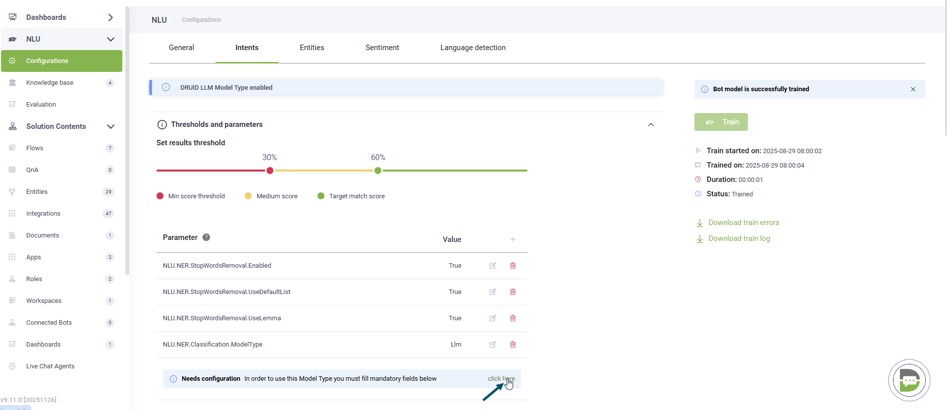 - Click Save to apply the NLU configuration.