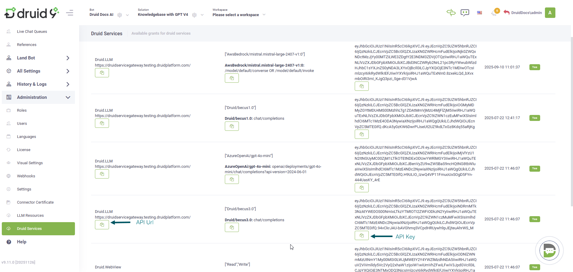 HINT: If you are using a Druid LLM resource (a model provided by Druid), you can find the necessary API Url and API key in the Druid Portal under Administration > Druid Services.