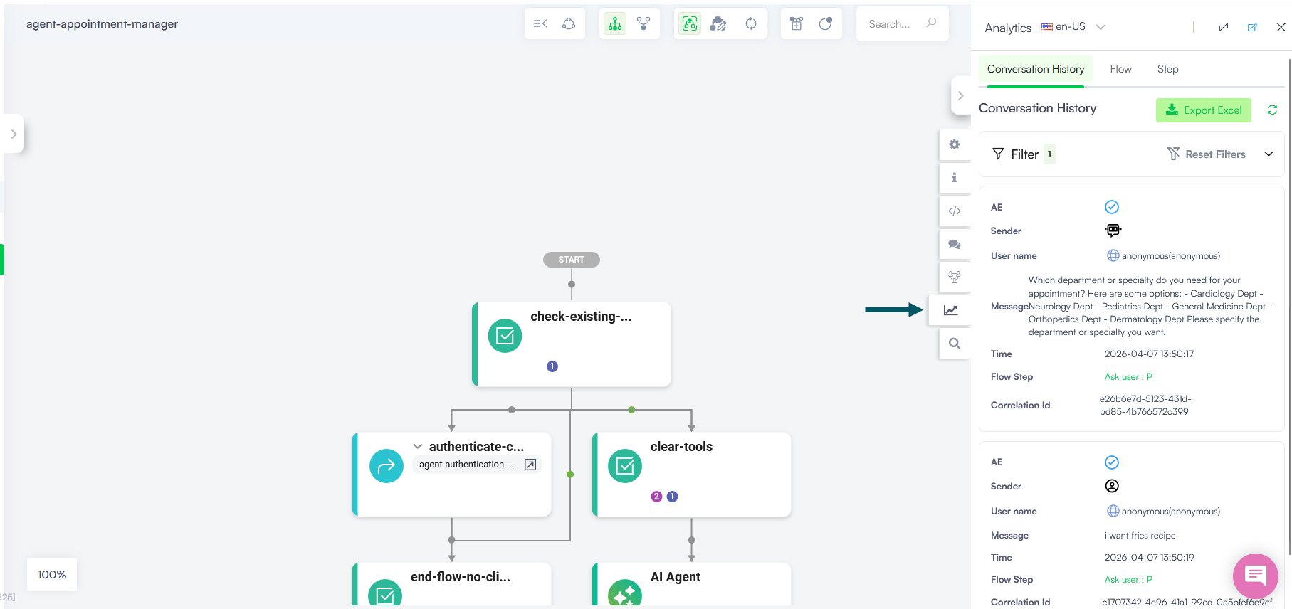 You can extract conversation data for external analysis, reporting, or auditing by using the Export Excel button from both global and flow-level Conversation History.