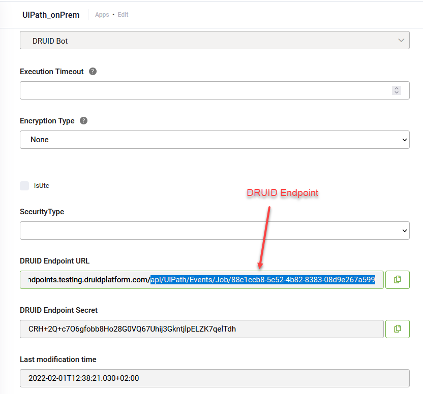- /api/UiPath/Events/Job/899839… is the dedicated Druid bot endpoint for UiPath integration.