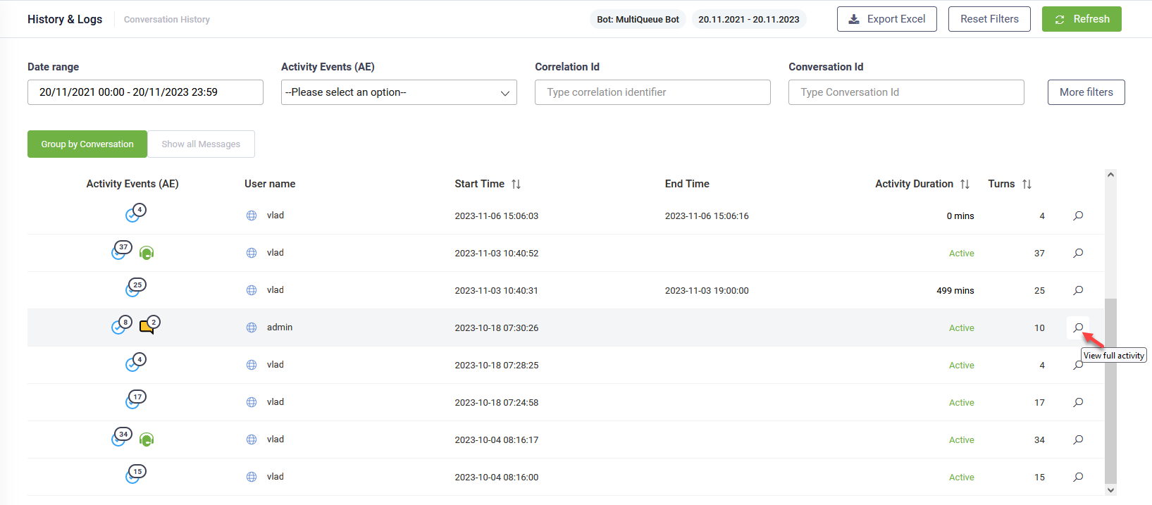 To see the full conversation transcript for a specific conversation, in the list of activities grouped by conversations, either click on the desired row or click the View full activity icon (