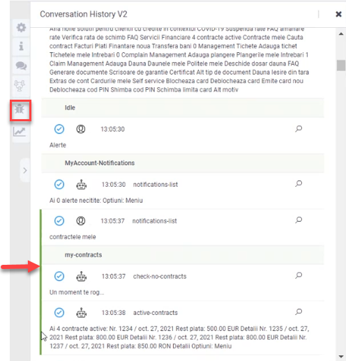 Druid allows debugging messages in the Flow diagram at a flow level. To do so, in the Conversation transcript, click on the flow name.
