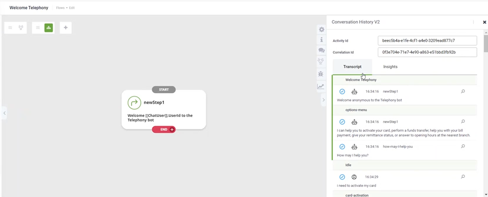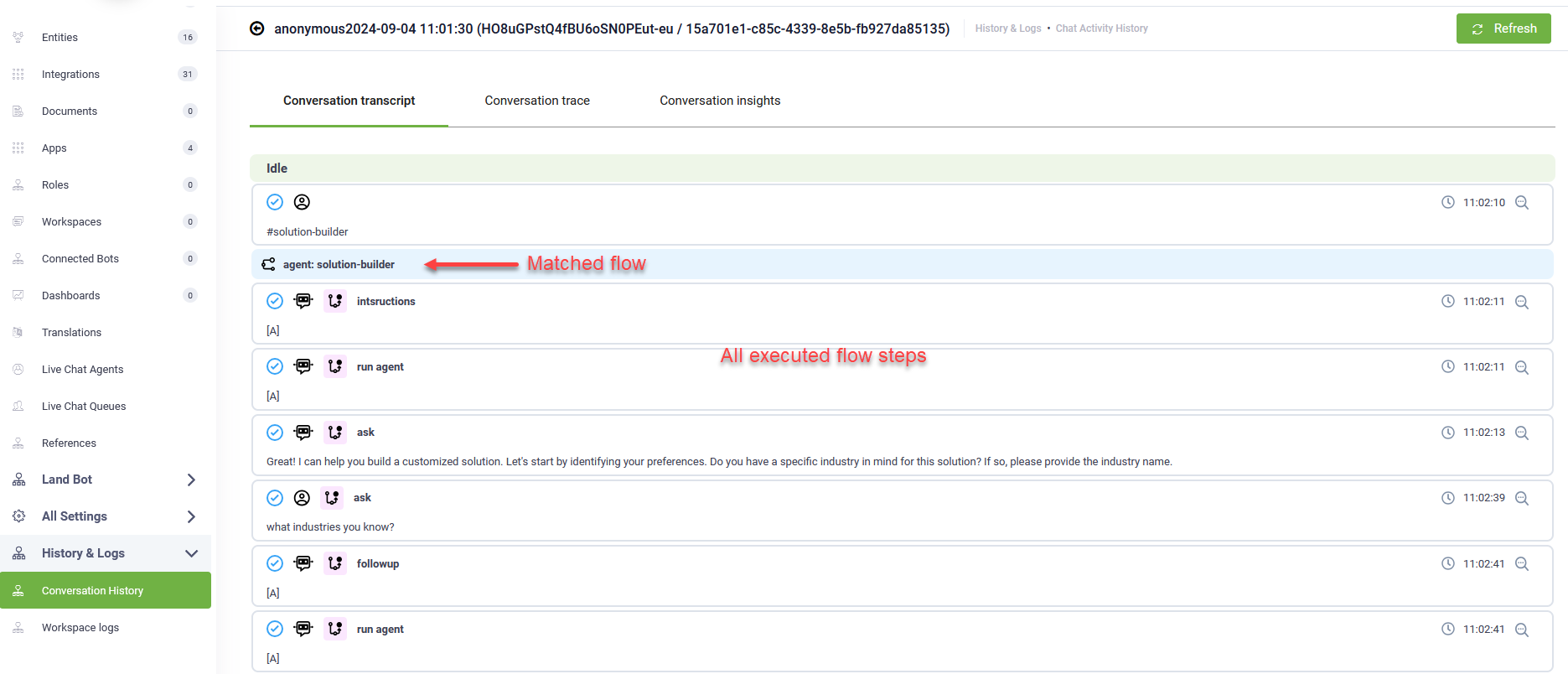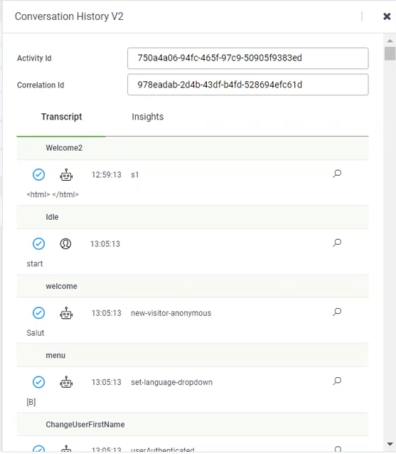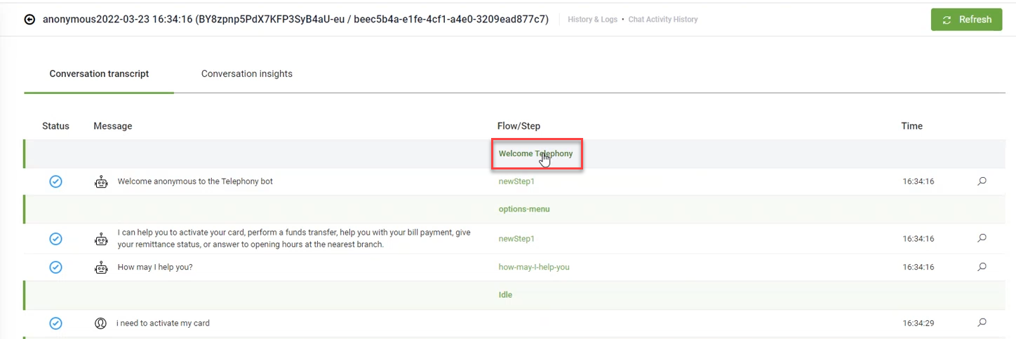 The conversation transcript provides you with all the messages sent during the conversation grouped by flows and detailed information per message to help you easily review what happened during the conversation: