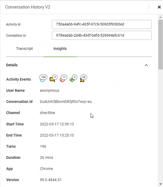 To view extensive insights of the chat activity, click the Insights tab. The insights provides you with an overview of the conversation activity, the data stored from the context of the [[ChatActivityData]] entity and the list of activity events raised during the chat activity.