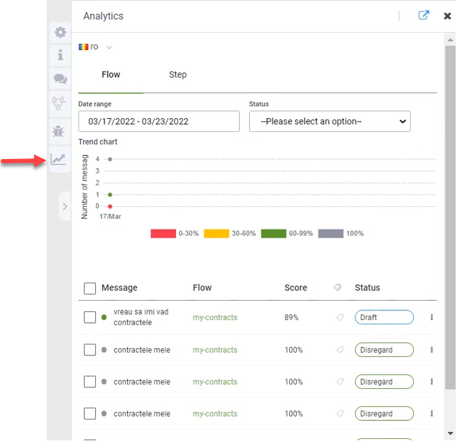 The analytics displays by default on the Flow tab and provides you with the list of utterances that triggered the current flow step, the user messages, their matching score and the status. You can use the Annotation tool to improve the bot-training model.