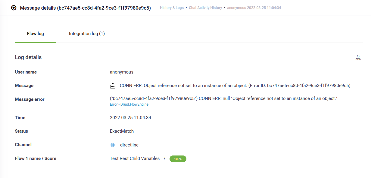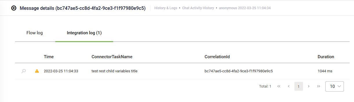 ) icon at the right-side of the message. The message details provides you with details from both the Flow log and the Integration log.