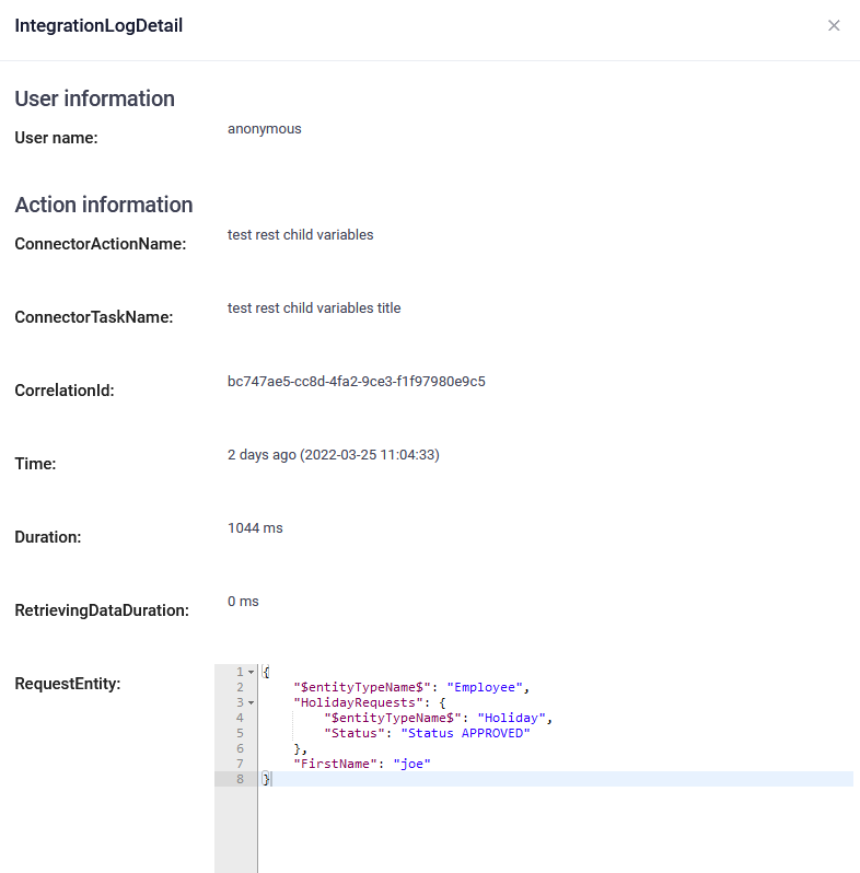 The Integration Log Detail page appears where you can see what happened during the selected connector action execution.