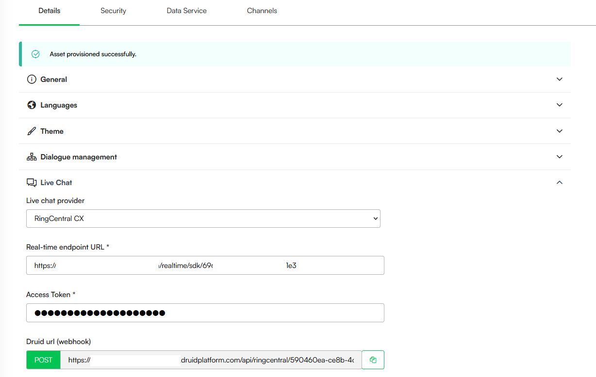 The following steps outline how to establish a connection between Druid and RingCentral CX to enable live chat hand-offs.