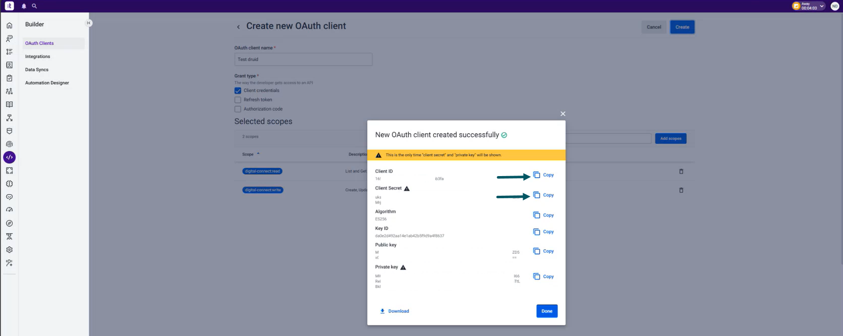 In Talkdesk, go to Builder > OAuth Clients and create an OAuth client with the following scopes: digital-connect:read and digital-connect:write. Copy the Client ID and Client Secret as you will need them in the Druid Portal.
