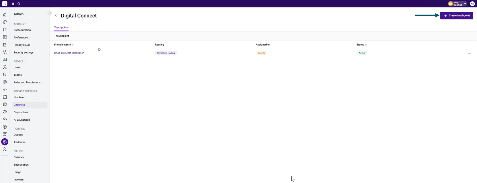 To create a new touchpoint for Druid integration, follow these steps in Talkdesk: