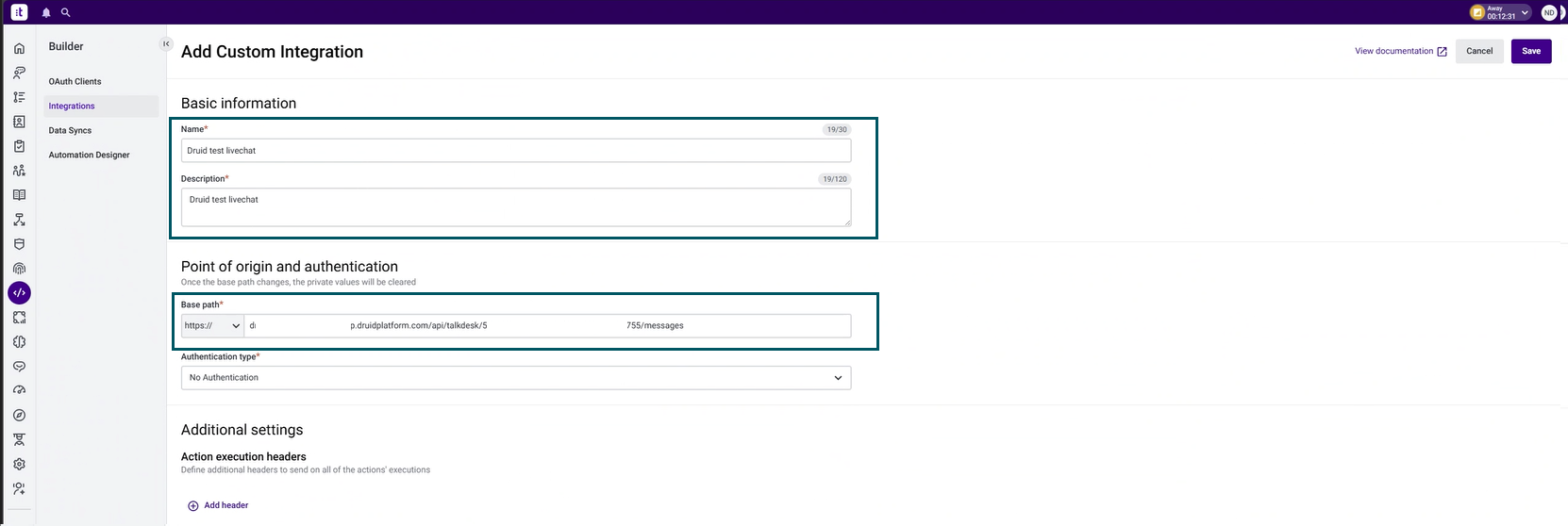 - In Talkdesk, go to Builder > Integrations and create a custom integration as follows: