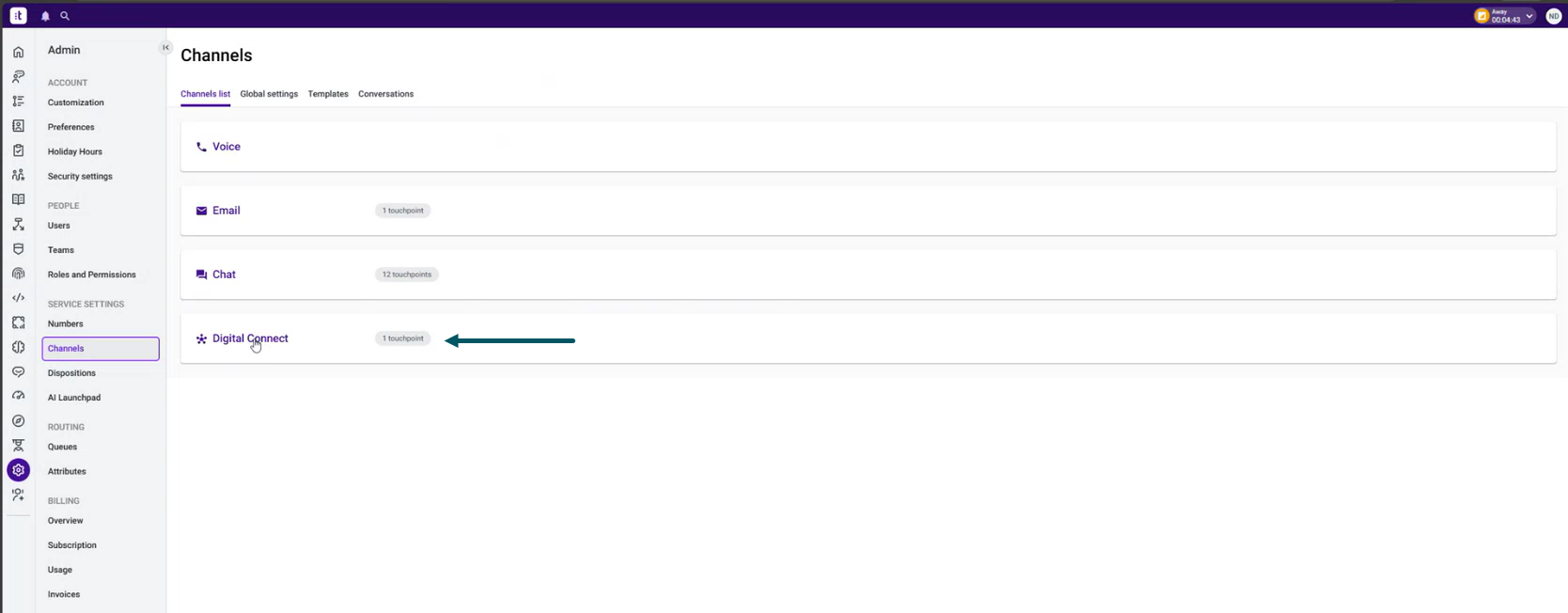 - Go to Admin > Channels and click Digital Connect.