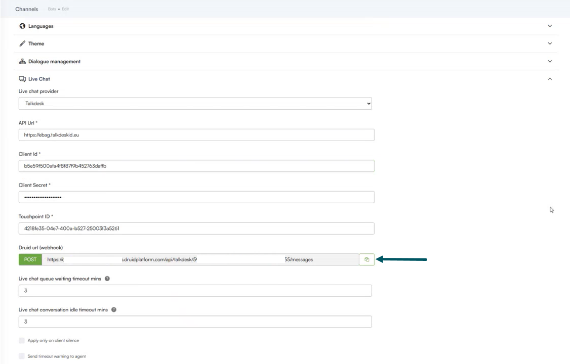 Go to the bot details again, click the Live Chat section and copy the Druid url (webhook). You’ll need this URL when creating a custom integration in Talkdesk.