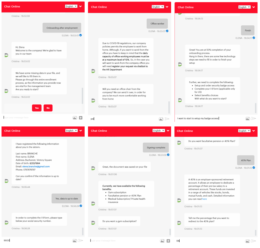 On your first day at work the chatbot can guide you through the work and safety program or COVID-19 regulations inside the company and you can even register your request to work from home. Also, the chatbot will guide you through the basic steps of your first technology setup guide (VPN access, obtain passwords and access to various folders depending on your position, configure badge access registration, etc.).