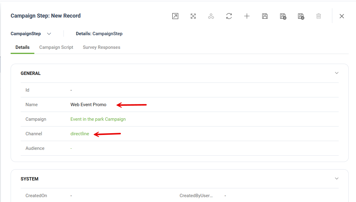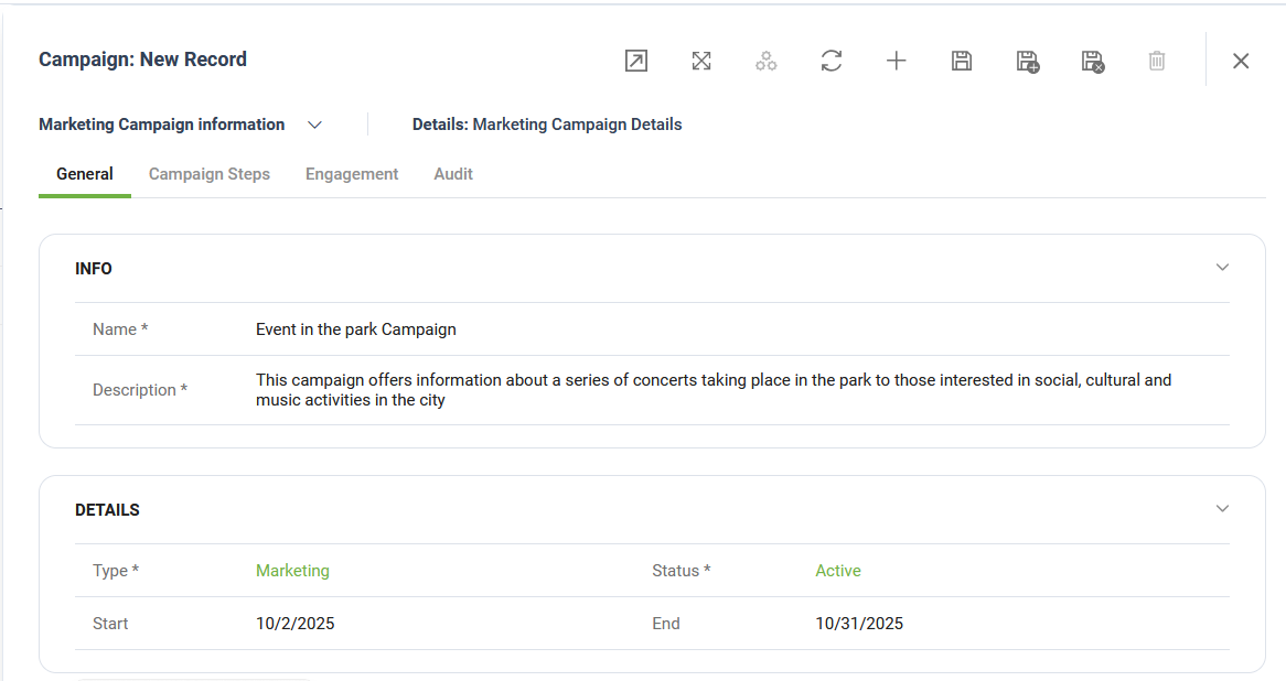 - Click the New Record icon in the top-right corner. This opens the Campaign creation page on the General tab.