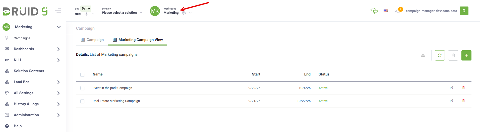 To build your first campaign, select the Marketing workspace and follow these steps: