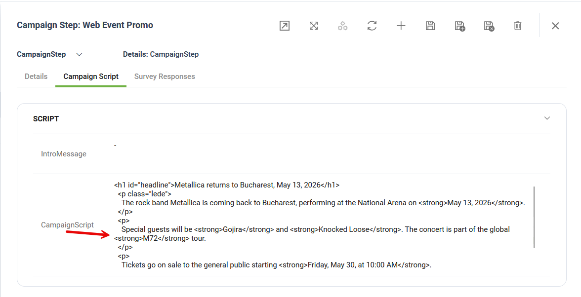 - Click the Campaign Script tab and fill in the Campaign message that will be delivered to all users. You can also add HTML code for a rich-format message.