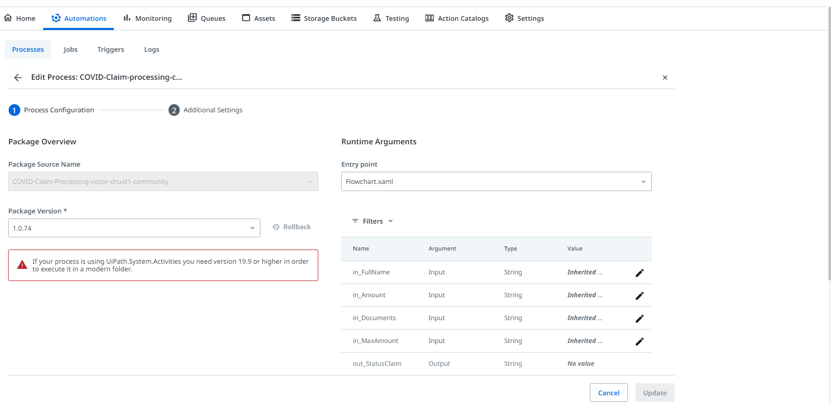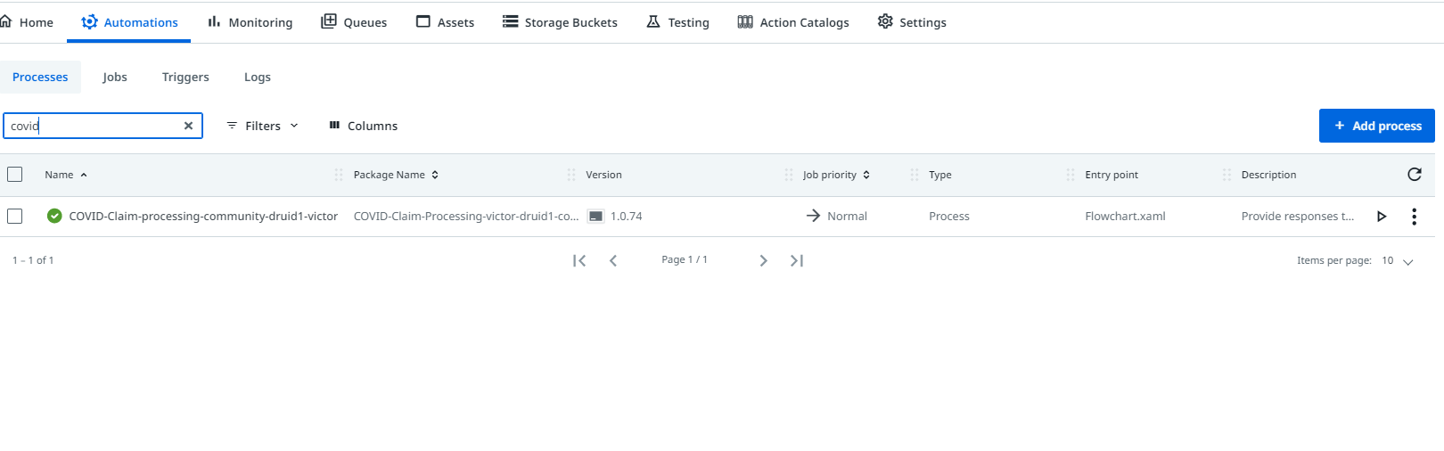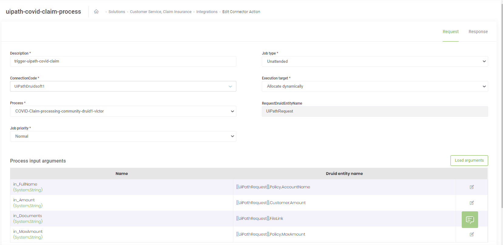 3. Go to integrations, on the connector action called uipath-covid-claim-process.