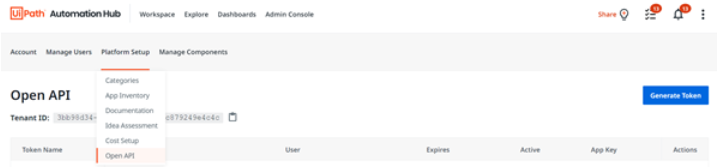 - In the UiPath Automation Hub Platform, go to Admin Console > Platform Setup > Open Api > Generate Token and generate a new access token to your environment. Copy the token and App Key, you will need them in Druid to authenticate the requests.