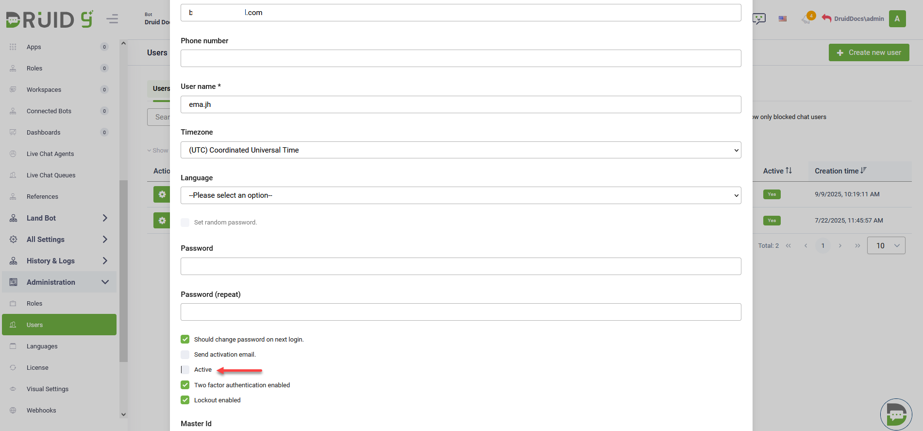 Hint: In DRUID versions prior to 9.5, you can permanently delete Portal users, but we recommend disabling them instead to preserve user history and associated data.