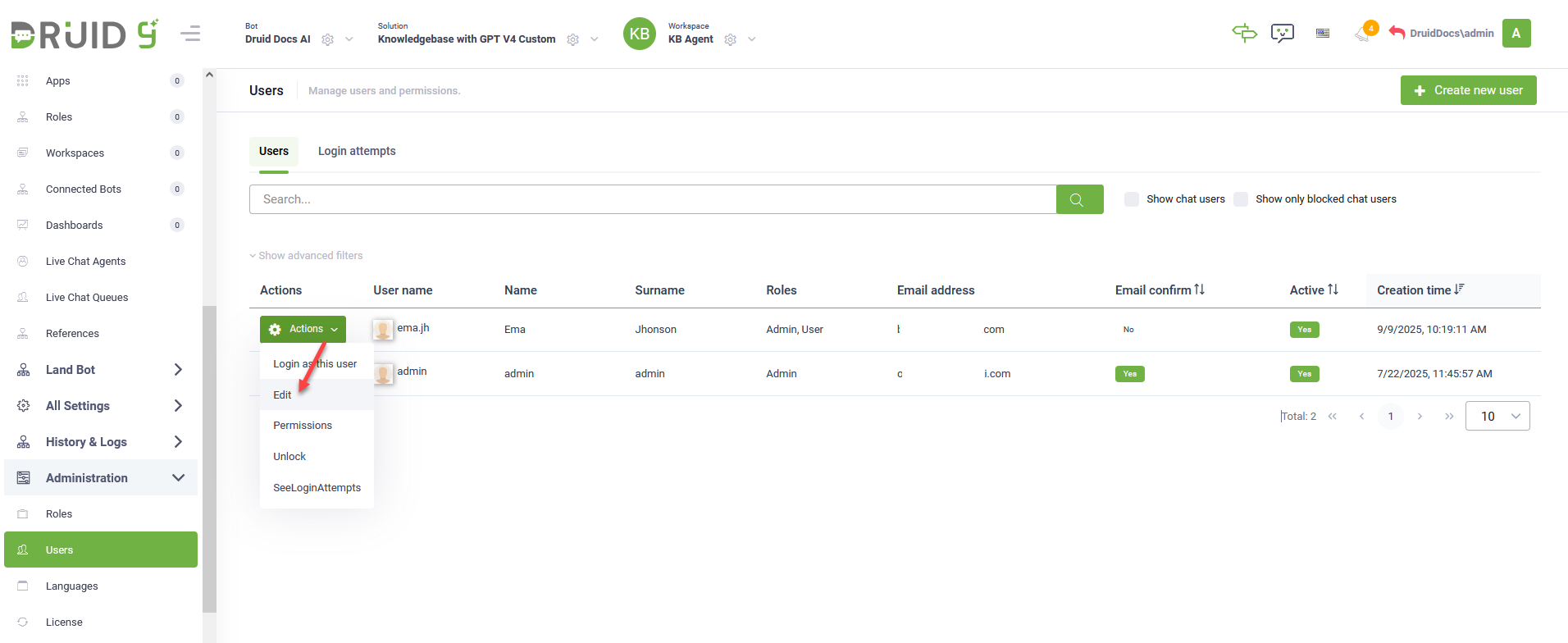 In DRUID prior to version 9.6, click Actions next to the user and select Edit.
