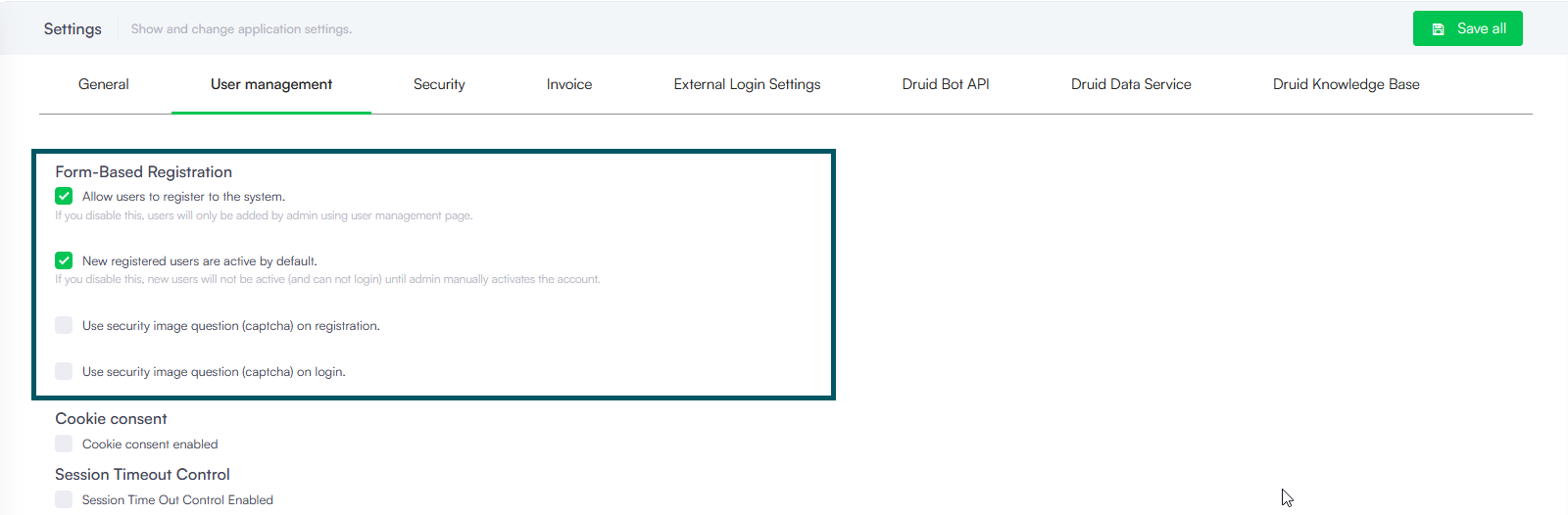 Druid provides built-in functionality to manage user registrations. To allow new users to register themselves to the Druid Portal, on the Administration menu, click Settings. In the Settings page, click the User Management tab, and in the Form-Based Registration area, select Allow users to register to the system.