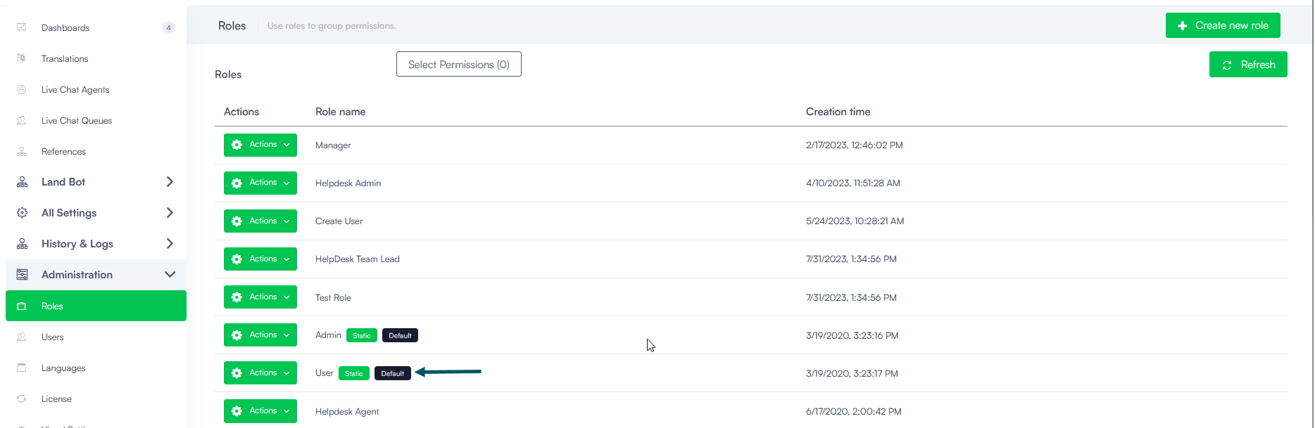 To set up default role(s) to be assigned to automatically provisioned users, from the Administration menu, click Roles. Edit the desired role(s) by selecting Default. You can create a new roles with permissions specific to your organization and set it as Default.
